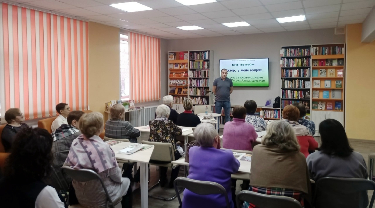 ← Все новости"Доктор, у меня вопрос…"В центральной библиотеке в рамках занятий клуба "ВечерОК" состоялся актуальный разговор-диалог с врачом – терапевтом районной больницы П. А. Заика. Петр Александрович говорил о том, как важно вести здоровый и активный образ жизни.