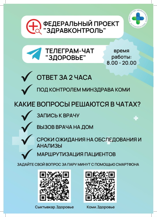 Это прямые каналы связи с представителями государственных медицинских организаций Республики Коми. В чатах вы можете оперативно задать вопросы, касающиеся детской медицины.